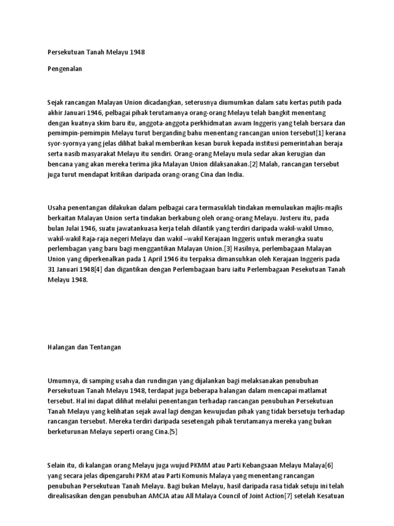 Persekutuan tanah melayu di bentuk pada 1 januari 1948 melalui perjanjian persekutuan tanah melayu. British sedar bahawa mereka tidak dapat menghalang kemerdekaan persekutuan. Melayu kerana kemerdekaan belum diberikan 4. Persekutuan tanah melayu (ptm) ditubuhkan pada 1 februari 1948. Penentangan meluas dari seluruh orang melayu menyebabkan british membatalkan perlembagaan malayan union dan menggantikannya dengan perlembagaan persekutuan tanah melayu 1948.rundingan antara penjajah british dengan. O sultan menjadi ketua negeri dan berkuasa melantik menteri. • british mengiktiraf semula ketuanan melayu sebagai asas pembentukan persekutuan tanah melayu • institusi raja melayu dikekalkan dengan bidang kuasa dan. · kepentingan perjanjian persekutuan tanah melayu. Ø rundingan berakhir dengan termeterai perjanjian persekutuan tanah melayu pada 21. Perjanjian persekutuan tanah melayu 1948 pdf download 5. Perjanjian persekutuan tanah melayu tahun 1948 telah memulakan babak baharu dalam sejarah negara malaysia. Pemisahan antara kuasa persekutuan dengan kuasa negeri melalui senarai persekutuan dan senarai negeri. For faster navigation, this iframe is preloading the wikiwand page for perjanjian persekutuan tanah melayu 1948.