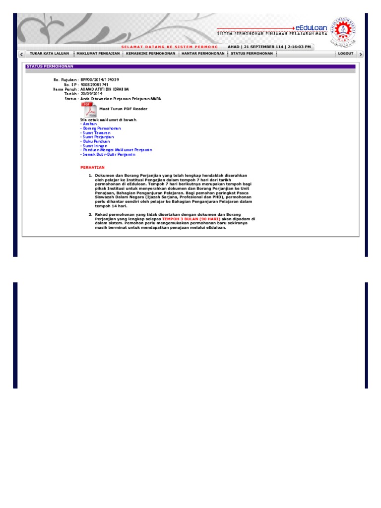Panduan buat anda yang ingin membuat pinjaman pelajaran, dimana bagi yang memenuhi kelayakan boleh membuat permohonan majlis amanah rakyat (mara) tahun seca2020ra online di portal rasmi mara. Apakah syarat am untuk permohonan pinjaman pendidikan mara. Mara hari ini telah membuka permohonan di mana menawarkan pinjaman pelajaran untuk pengajian di peringkat pasca siswazah (master & phd) dan peringkat profesional di institusi pengajian tinggi terkemuka dalam dan luar negara. Mara offers education loans in the form of convertible loans for post graduate levels (master's degree and doctor of philosophy) at leading institutions of higher education locally and abroad to outstanding graduates in fields that have a significant impact on national employment needs. Baca entri saya mengenai interview dan psikometrik test mara untuk tawaran pascasiswazah sebelum ini. Pinjaman ini biasanya diberikan kepada pelajar bumiputera berkelayakan untuk meneruskan pengajian di institut pengajian mara (ipma) dan institusi pengajian tinggi swasta tempatan (ipts). Kelulusan rasmi permohonan pengurangan boleh disemak melalui sistem e baki. Untuk pengetahuan, jumlah tunggakan hutang pinjaman mara ada lebih kurang rm600 juta. Untuk menyemak baki pinjaman anda ikuti langkah mudah berikut: Syaza nazura on twitter mara graduate excellence programme grep convertible loans for postgraduate studies master s and phd in malaysia and other countries pinjaman. Assalamualaikum, okay, saya nak sambung entri mengenai sambung belajar ( sarjana atau phd ) di luar negara. Setiap tahun, mara menawarkan biasiswa tawaran untuk program tempatan dan luar negara. Adakah anda memerlukan pinjaman pelajaran atau bantuan biasiswa untuk pengajian ipta/ ipts?