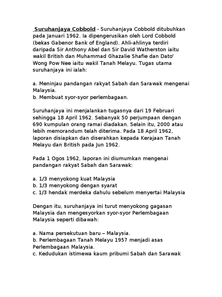 Suruhanjaya Cobbold from img.pdfslide.tips Suruhanjaya ini dinamakan suruhanjaya cobbold sempena nama mengerusinya, lord cobbold. Kata orang kalau tidak tahu sejarah oleh itu perkara ini (pensepakkatan persetujuan) diterima pakai la dalam proses penubuhan negara malaysia. Suruhanjaya bebas yang dianggotai oleh lima orang ini dipengerusikan oleh lord cobbold. Pembentangan suruhanjaya cobbold telah mengesyorkan beberapa syor mengenai penubuhan persekutuan malaysia, iaitu : Untuk tujuan ini maka pada januari 1962, suruhanjaya cobbold ditubuhan, diketuai oleh lord cobbold. Tujuan penubuhan suruhanjaya cobbold : 1) suruhanjaya cobbold berfungsi menilai reaksi penduduk terhadap pembentukan malaysia. Tujuan penubuhan suruhanjaya cobbold adalah untuk :
